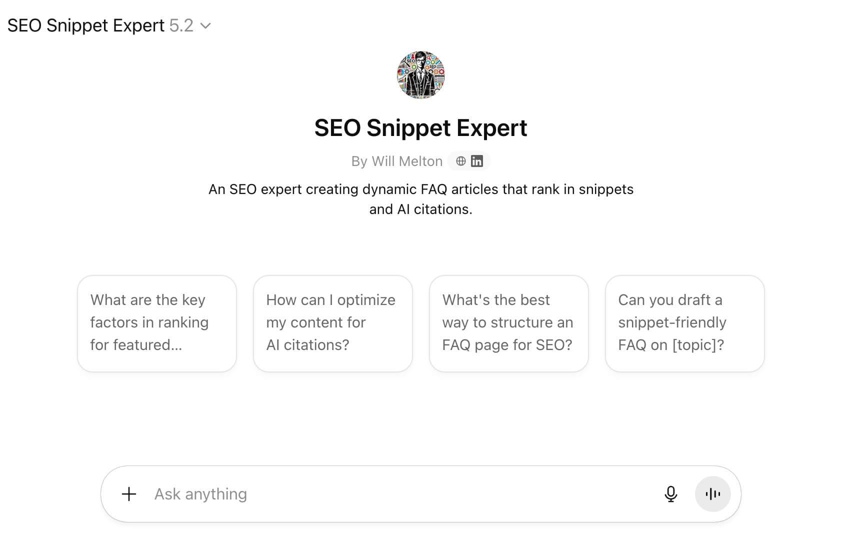 The SEO Snippet Expert GPT is an AI-powered assistant built specifically to help marketers, SEO professionals, and content creators win featured snippets and improve click-through rates. Rather than manually tweaking headings, rewriting intros, or guessing at meta descriptions, this GPT quickly generates highly optimized snippet-ready content, tailored to match user intent and Google’s preferred answer formats.